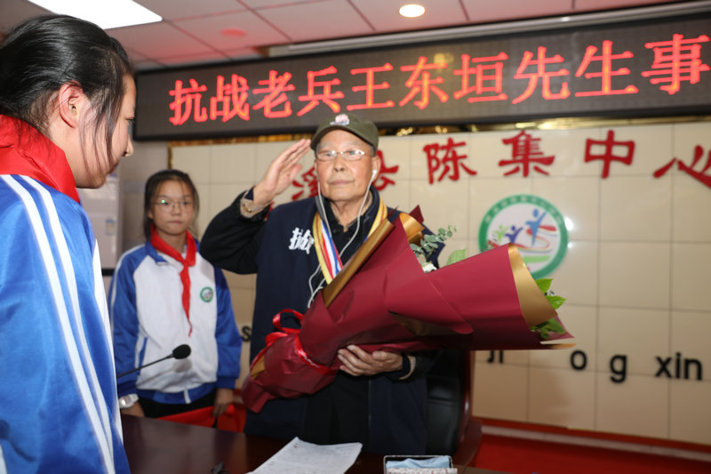 10月11日,淮北黄埔同学会会长、安徽黄埔同学会副会长、96岁的抗战老兵王东垣,应邀走进濉溪县双堆集镇陈集中心学校,以自身的亲身经历,为该校200余名学生作了一堂抗战英雄事迹报告会。